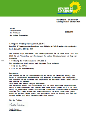 In der letzten Kreistagssitzung gab es einen grünen Änderungsantrag zu einer Vorlage zur "Verwendung der Zuweisung gem. §15 Abs. 4 FAG für weitere Infrastrukturlasten in den Jahren 2018 bis 2020" gestellt :